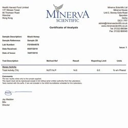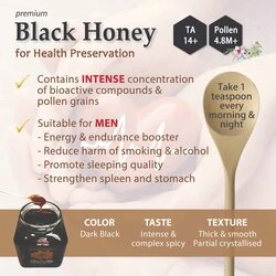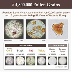- PREMIUM BLACK HONEY: – Total Activity 14+ Pollen Count 4.8M+ Pollen Varieties 150+ – Intense Choice for Health Preservation suitable for MEN: 1) Energy & endurance booster 2) Reduce harm of smoking & alcohol 3) Promote sleeping quality 4) Strengthen spleen and stomach TOTAL ACTIVITY: – The origin and nectar source determine the bioactivity of honey. – The bioactivity of Tualang Honey is measured by Total Activity rating, equivalent to the UMF rating commonly used by Manuka honey. – Honey with Total Activity 10+ or above reports therapy efficacy. – Premium Black Honey has Total Activity 14+, as tested by Minerva Scientific, UK. POLLEN GRAINS: – Pollen grains in honey reveal its authenticity and origin. – In the global honey market, Health Harvest is one of the very few brands fully disclosing pollen grains of our Tualang Honey products to the consumers. – It is estimated that every 10 grams of Premium Black Honey contains more than 4.8 million pollen grains