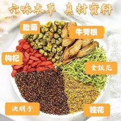- Ingredients: chrysanthemum, wolfberry, burdock, cassia, osmanthus, honeysuckleEfficacy: clearing liver and improving eyesight, dispersing wind-heat, soothing throat and reducing swelling, clearing heat and detoxifying, nourishing liver and kidney. Helps to clear heat and detoxify, dry dampness and invigorate the spleen, appetizers and laxatives, balance blood pressure, regulate blood lipids, beautify and remove freckles, and prolong life.Suitable crowd: Most people can drink chrysanthemum honeysuckle, wolfberry, burdock root, and cassia seed tea, especially for people who get angry, stay up late, overuse the eyes, and have constipation.Burdock root is rich in carotene, and its content is 280 times that of carrots. Carotene is the source of vitamin A. The lack of vitamin A in the human body will cause systemic rough and dry skin. Therefore, drinking burdock tea regularly is beneficial to the delicate and smooth skin. The crude fiber in burdock helps to im
