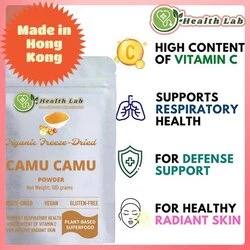 - Camu camu is a low-growing shrub found throughout the river corridors of the Amazon rainforest of Peru and Brazil.Camu camu is most famous for its mega-C content, containing 30 to 60 times more vitamin C than an orange. In addition it contains beta-carotene, potassium and many amino acids.This organic camu camu powder is low temperature processed and has a sweet and sour flavor. It can be easily added to smoothies, drinks, desserts and many other foods. The mission of Health Lab is to provide premium organic superfoods that increase energy and enhance health.DescriptionFood for the Modern LifeAntioxidantsVitamin CAmino AcidsOrganicRainforest SuperfruitThe Powder of SuperfoodsRaw | Vegan | Kosher Benefits:BioflavonoidsPotassiumBeta-CaroteneSuggested Use:SmoothiesYogurt and GranolaWater and JuiceOther IngredientsOrganic camu camu powder (myciaria dubia)Allergen Information: Packaged in a facility that also handles tree nuts. Weight/ Size: 100g